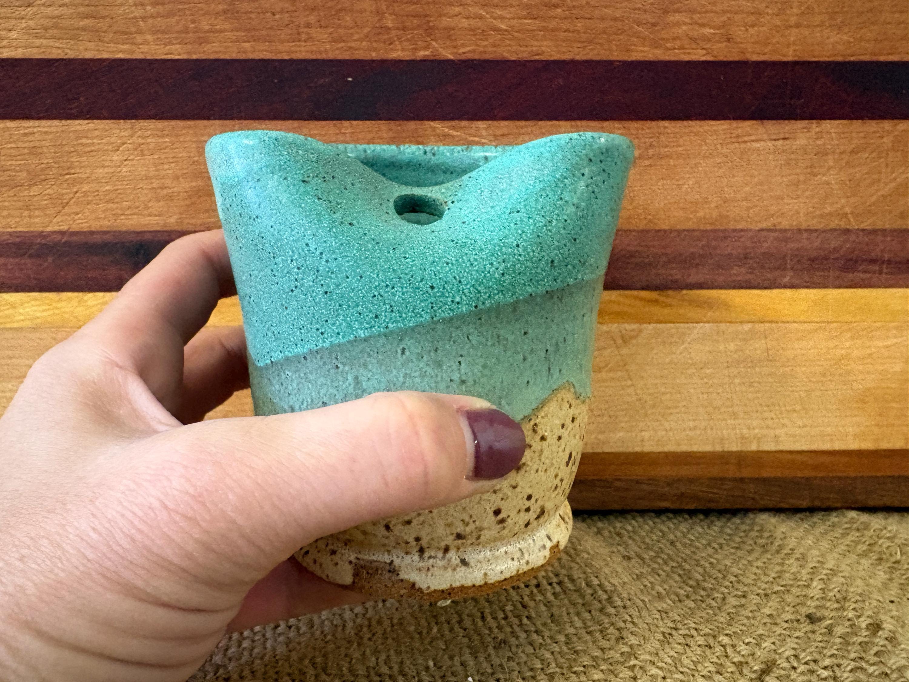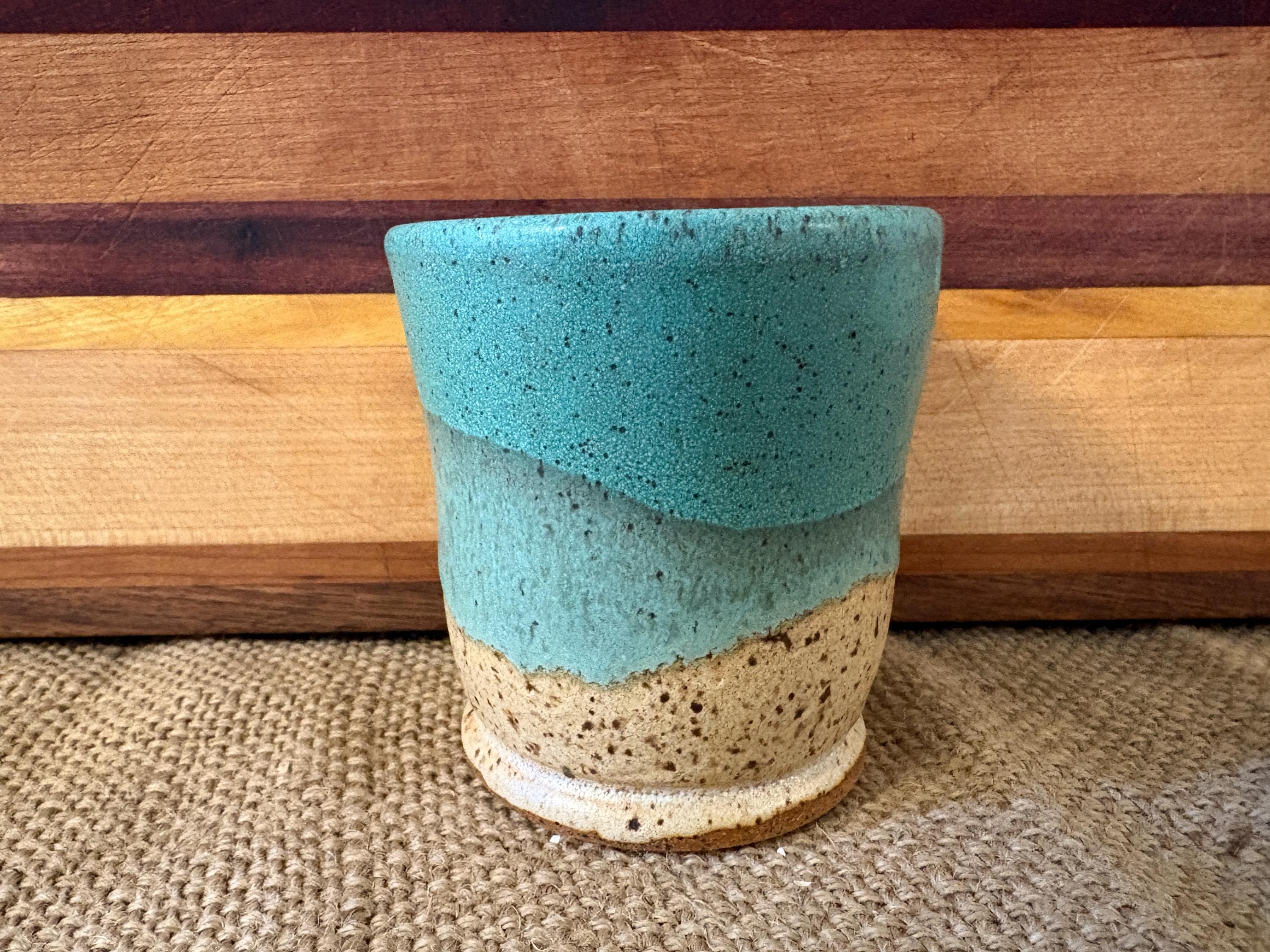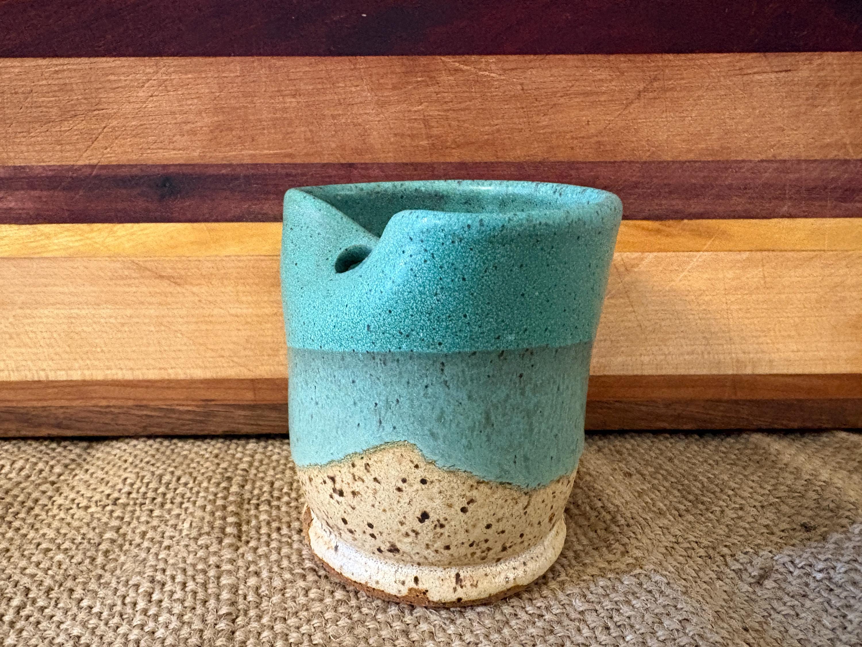 Small tumbler with a hole for a straw. Glazed in beautiful green copper color.