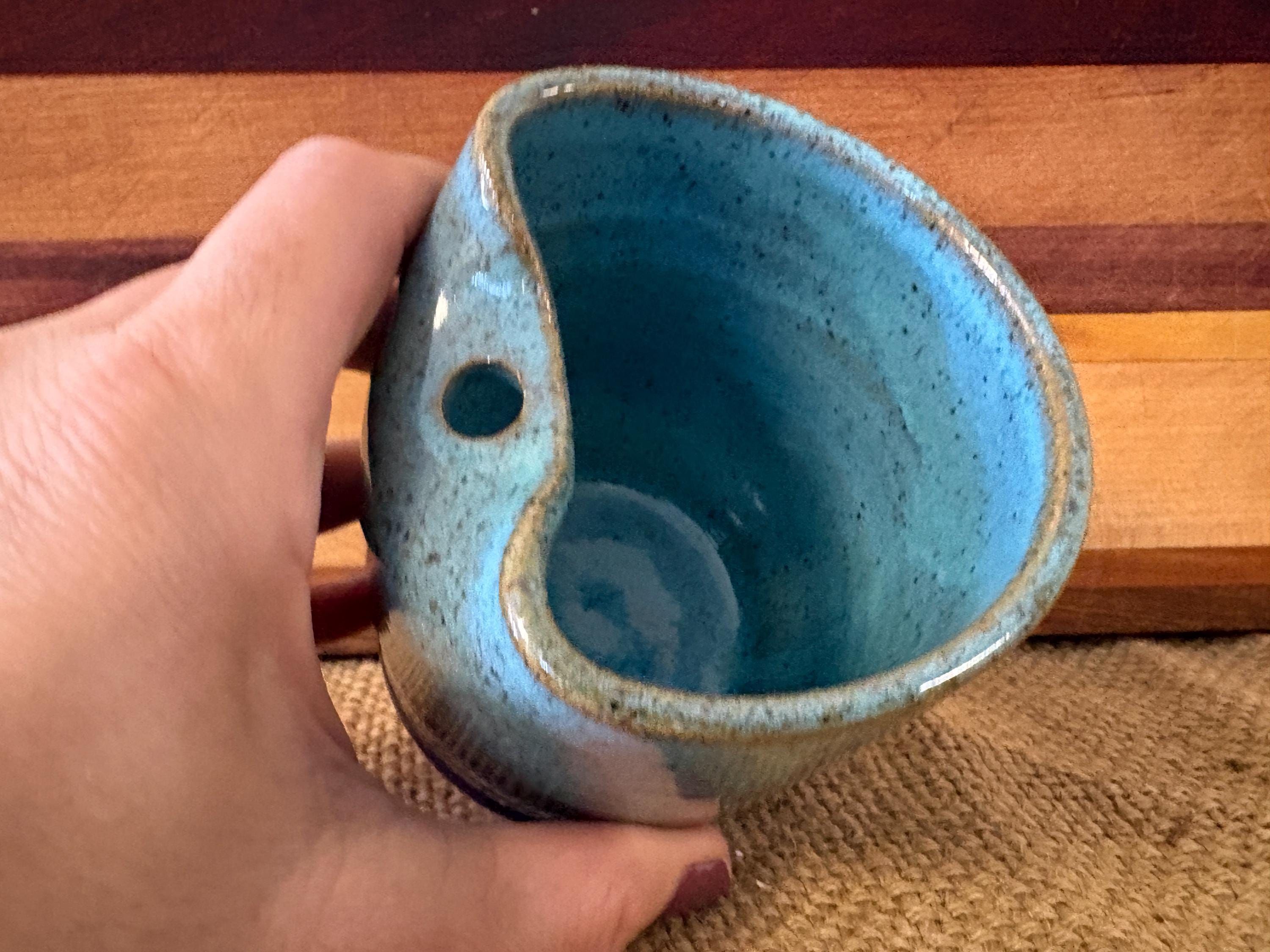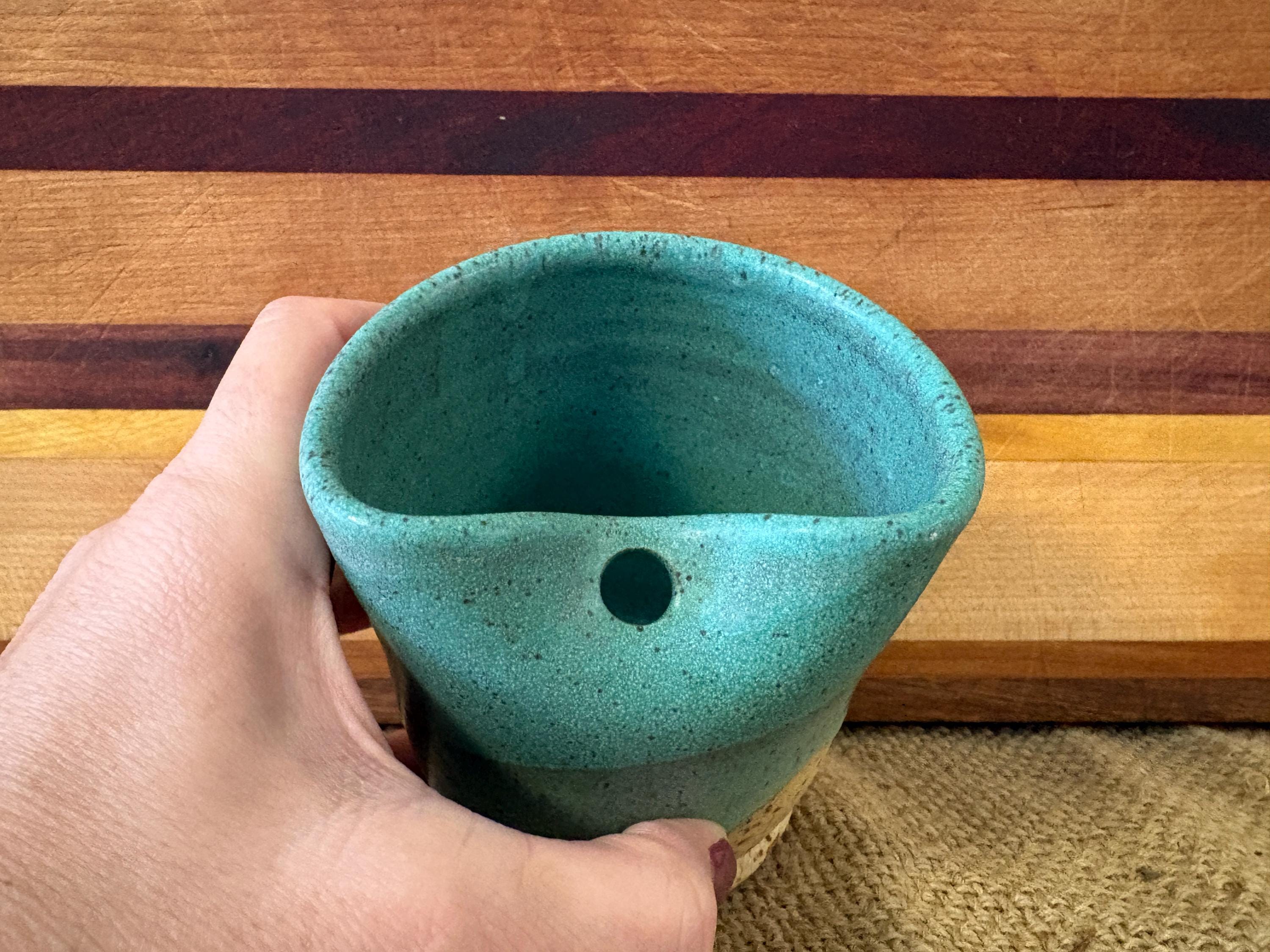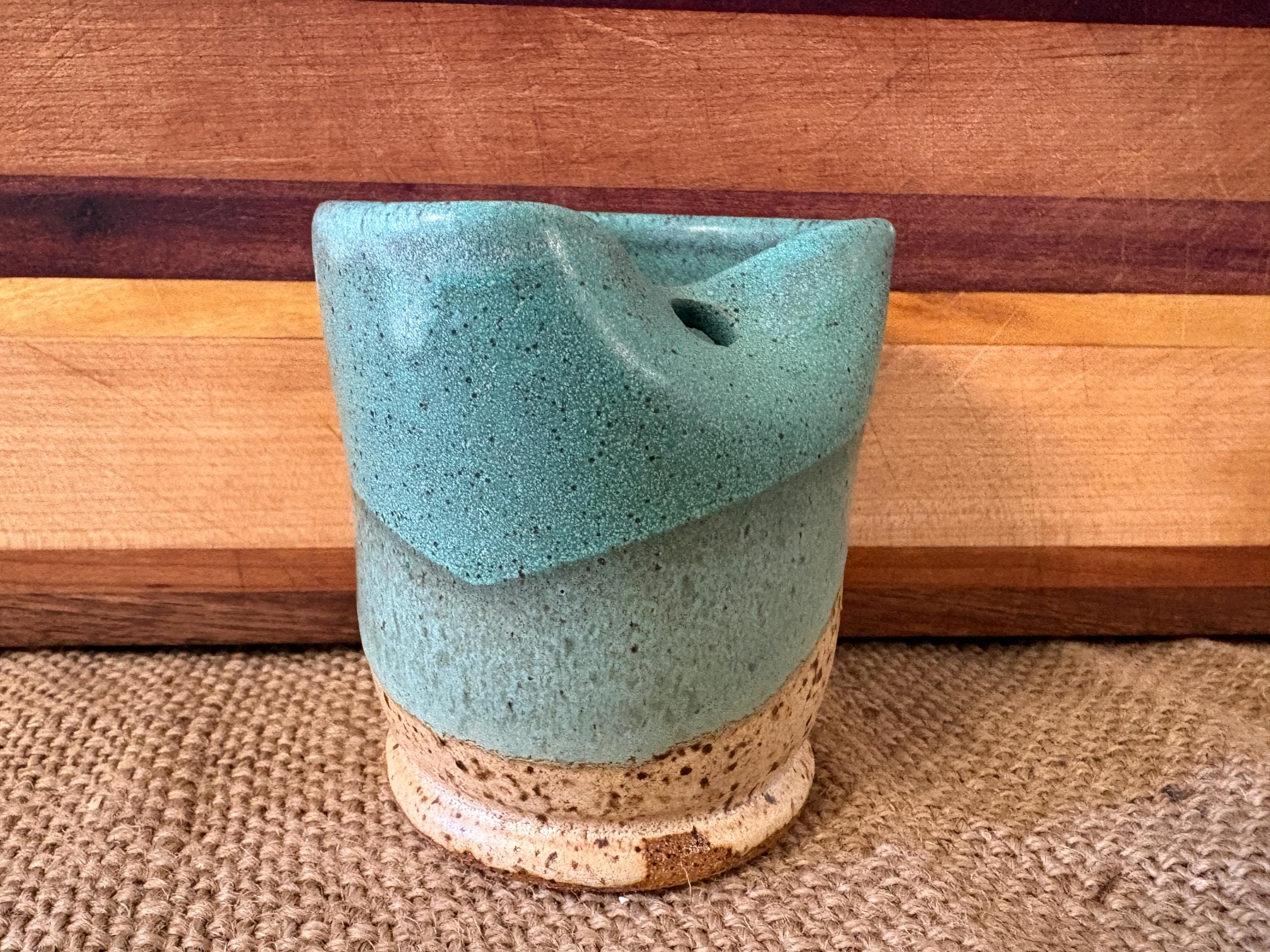 Small tumbler with a hole for a straw. Glazed in beautiful green copper color.