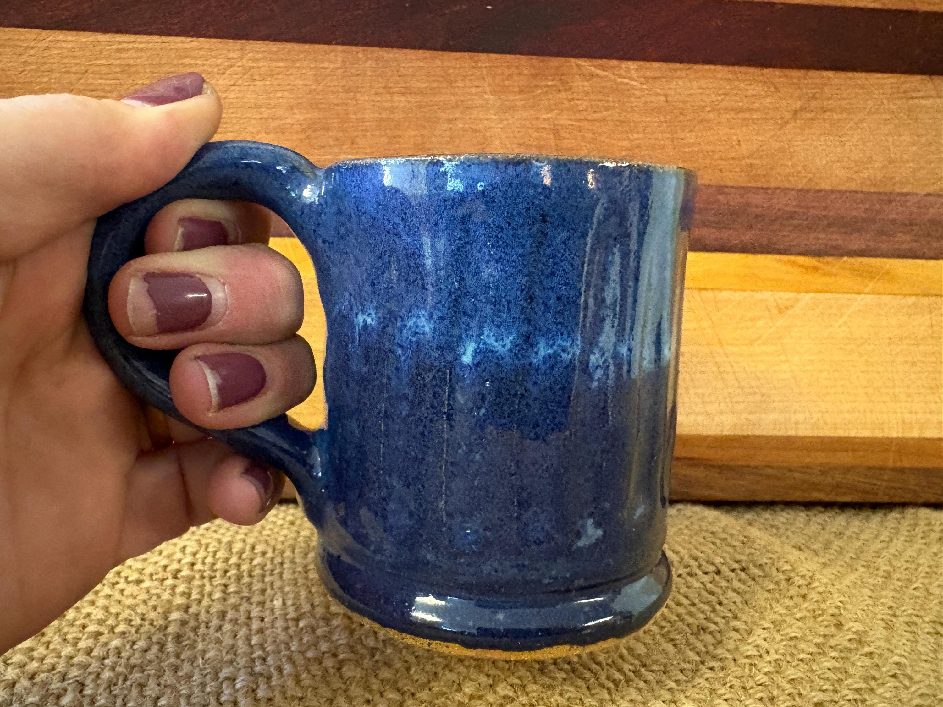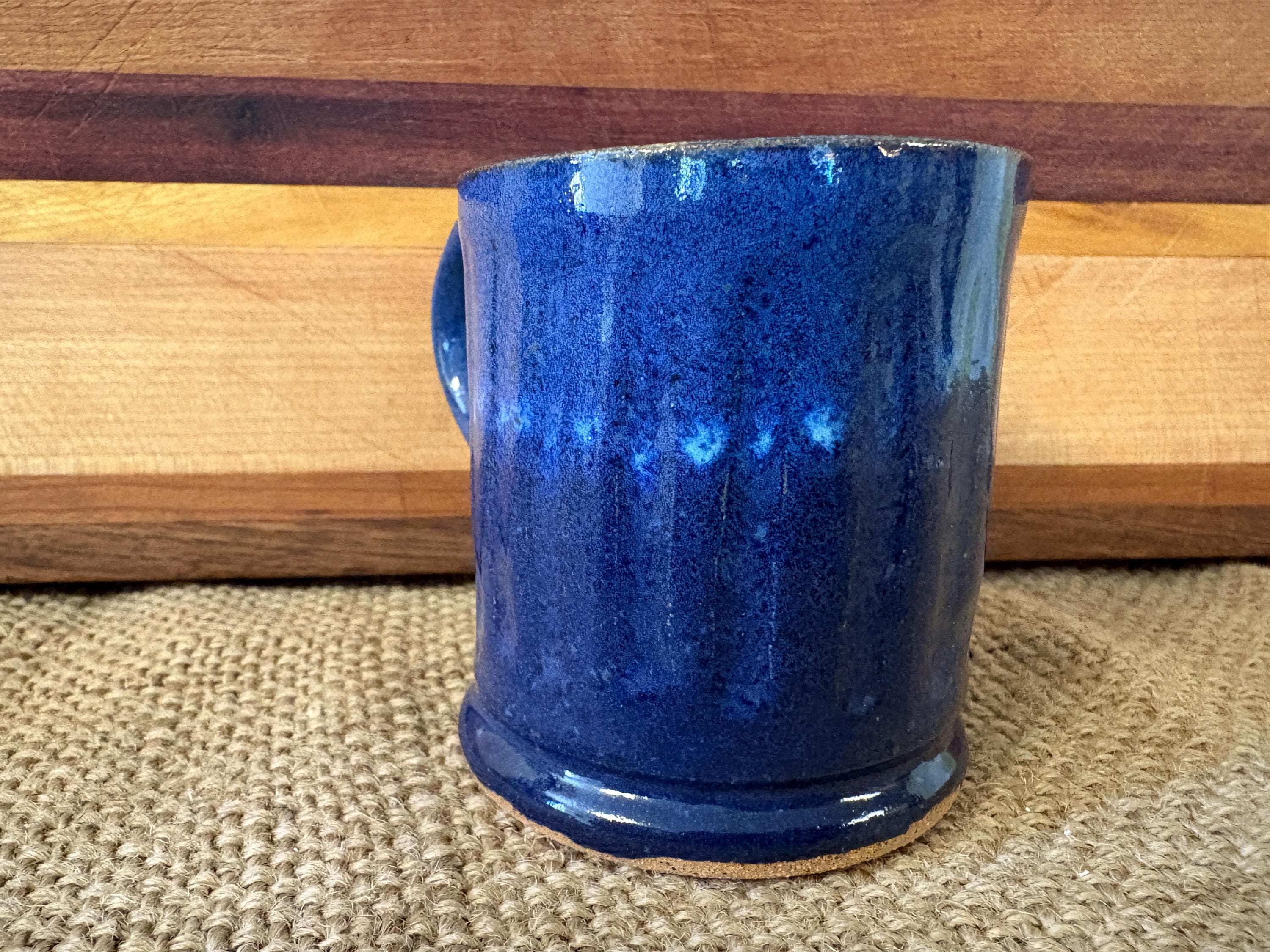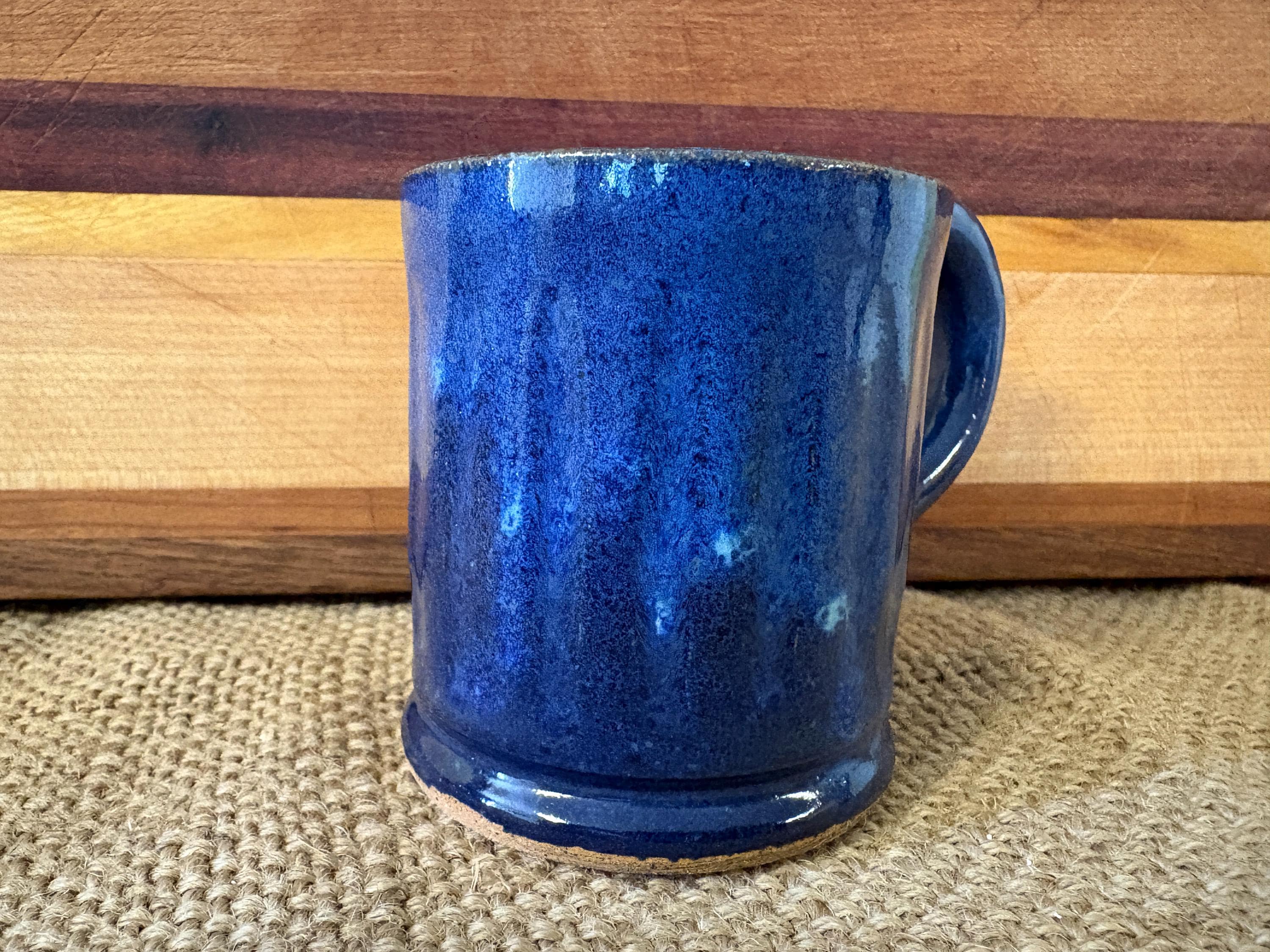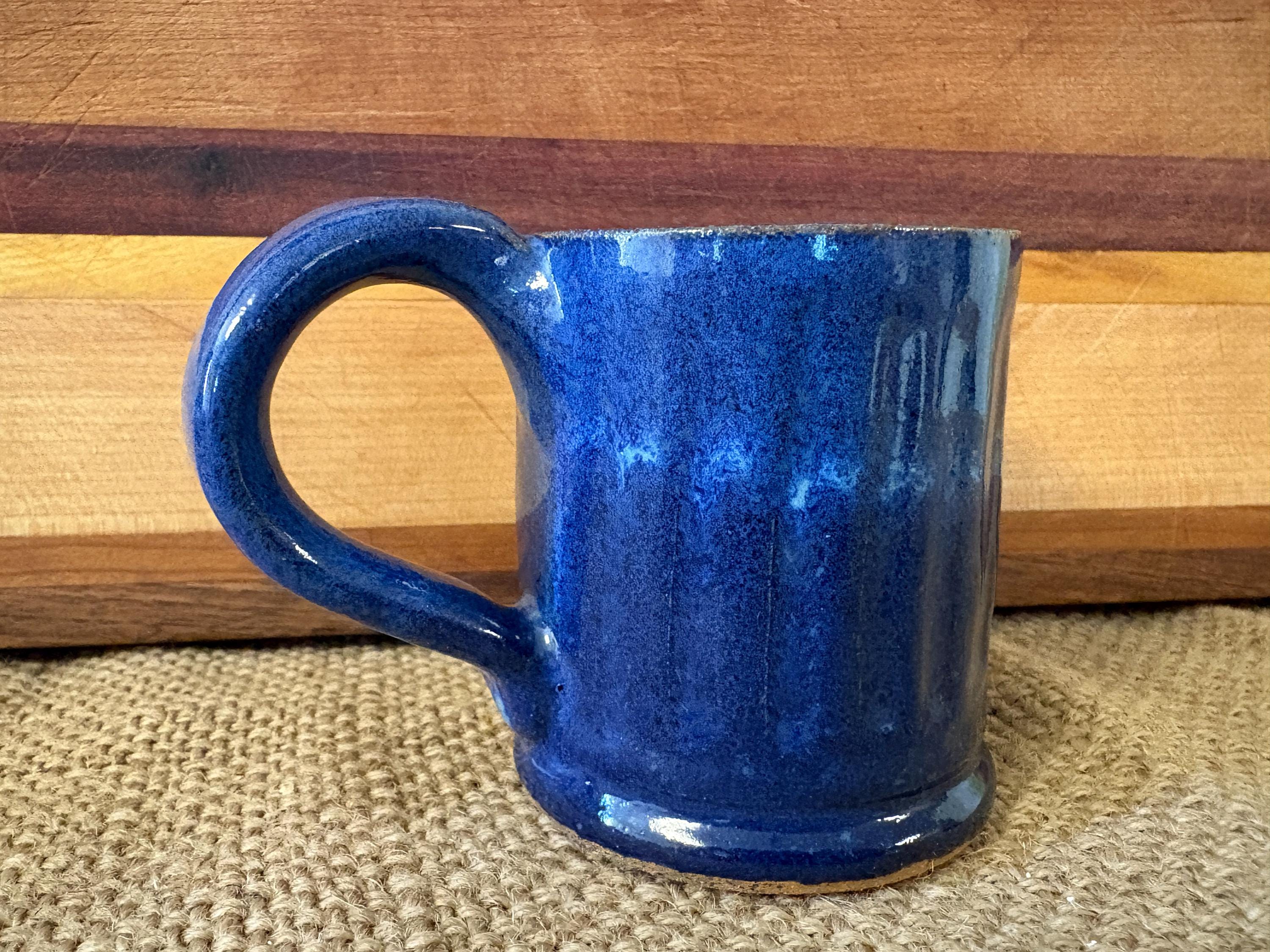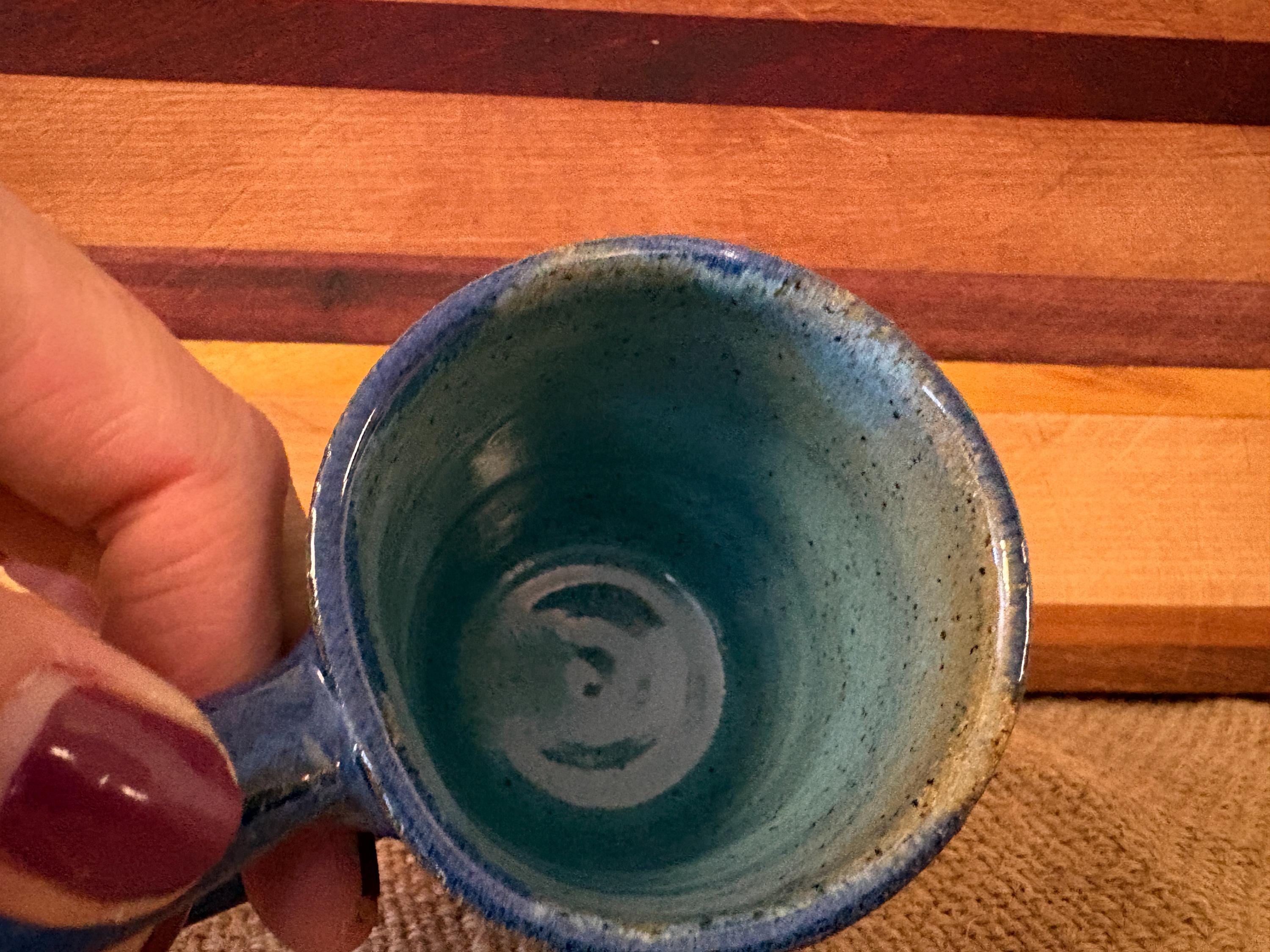 Cute little wheel thrown espresso mug. Glazed in a beautiful sapphire color on the outside and a light blue on the inside.